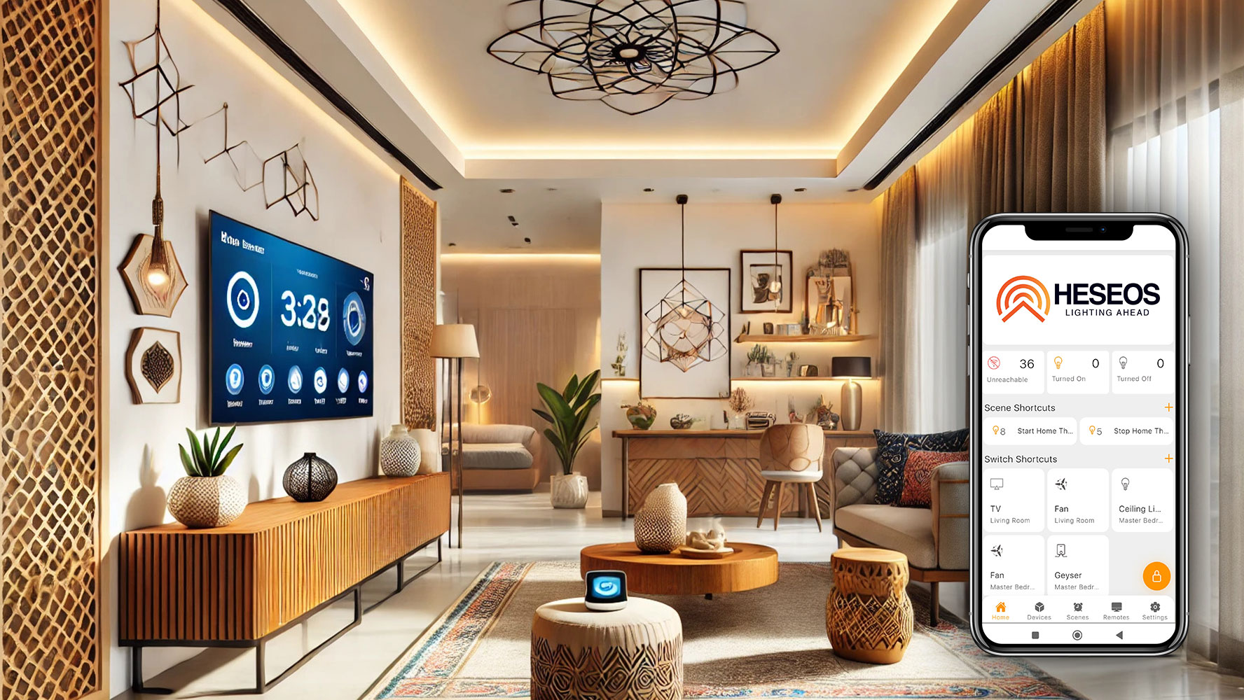 Your home, your mood. Set the perfect ambiance for movie nights or relaxation with just a tap. Heseos makes personalized living effortless.